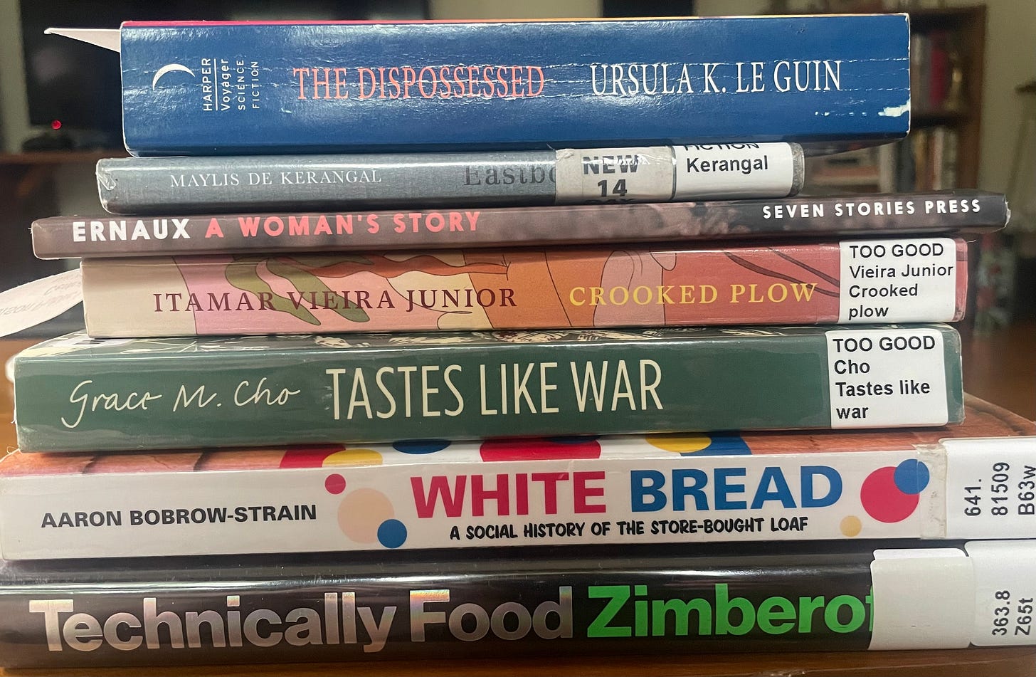 My reading habits are a bit idiosyncratic, but tend to wend between nonfiction in the forms of memoir, social history, and social critique, and literary fiction. I’ve struggled to read sci-fi (more on that later), even when friends urge me with, “but it’s about leftist revolutionaries, it’s an allegory!” Recommendations and reading habits from friends (hi Sarah) and writers (Margaux Vialleron, Alicia Kennedy, and Devin Kate Pope are big influences) help guide me to discover new ideas and perspectives that might shift my interests and philosophies in new directions, “what I read” not contained within a box, but becoming its own constellation.